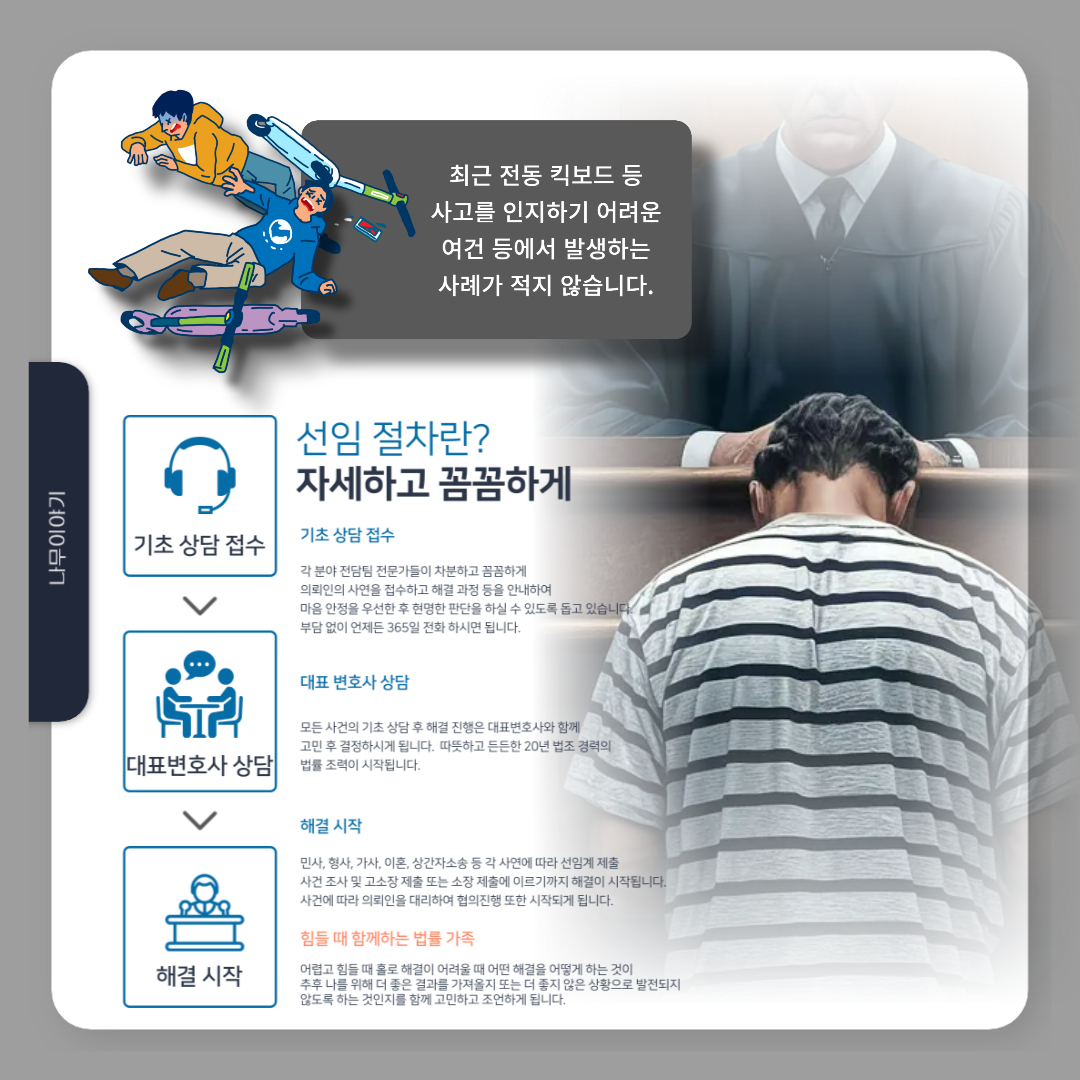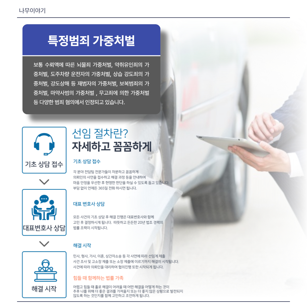 의뢰인의 마음 안정을 우선에 두어 사건 해결의 과정 동안 변호사와 의뢰인 간 팀워크를 통해 더욱 냉철하고 더욱 가치 있는 법익을 실현하기 위해 노력하고 있습니다. #음주운전 #보복운전 #운전자폭행 #뺑소니사고 공무집행방해 등의 사건에서 빠른 초기 대응 및 사건에 대한 법리 분석을 통한 소명 절차입니다.