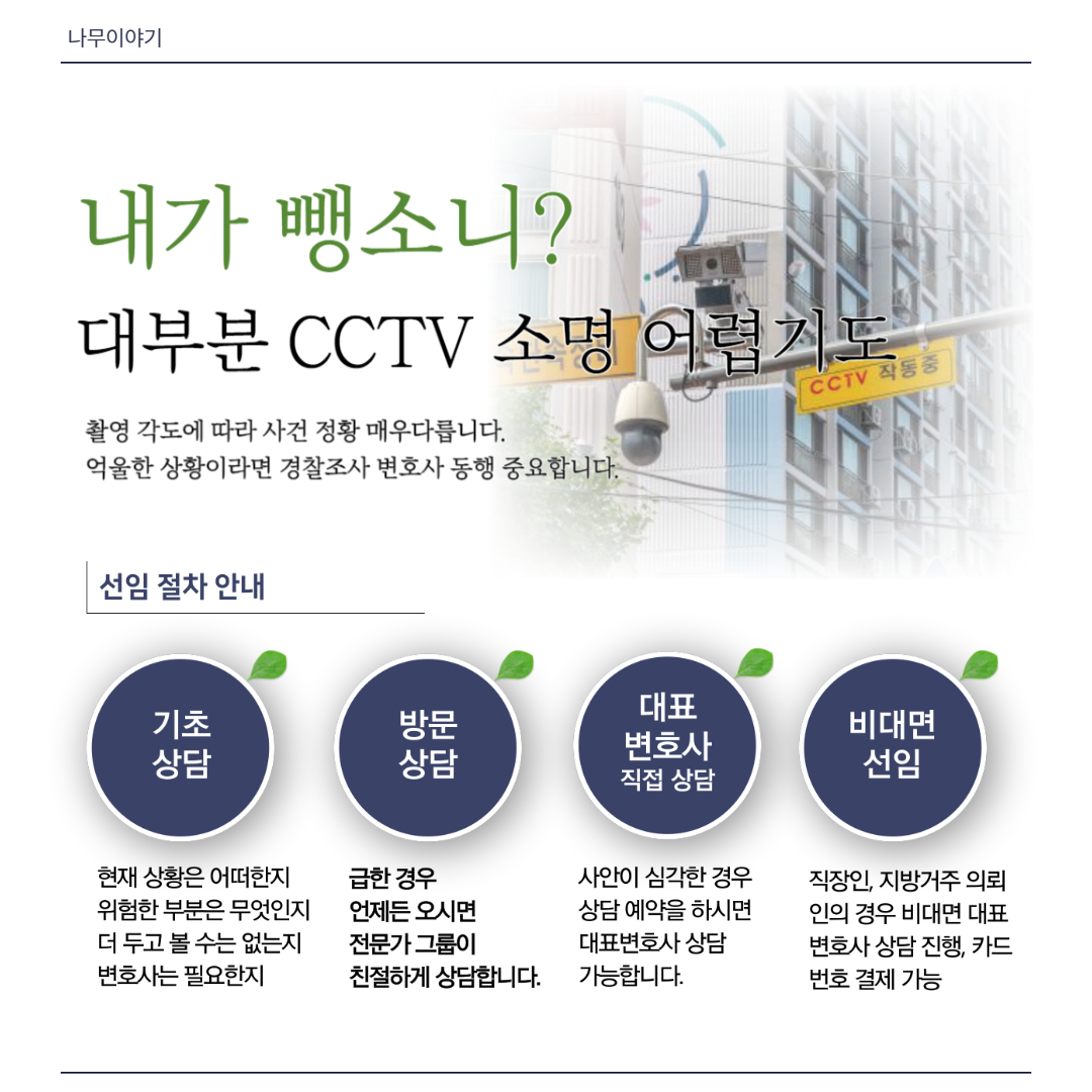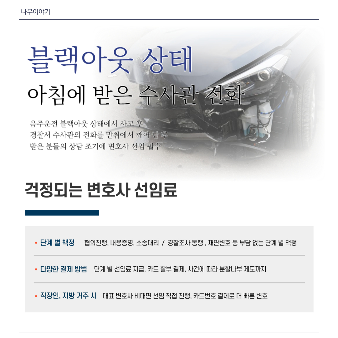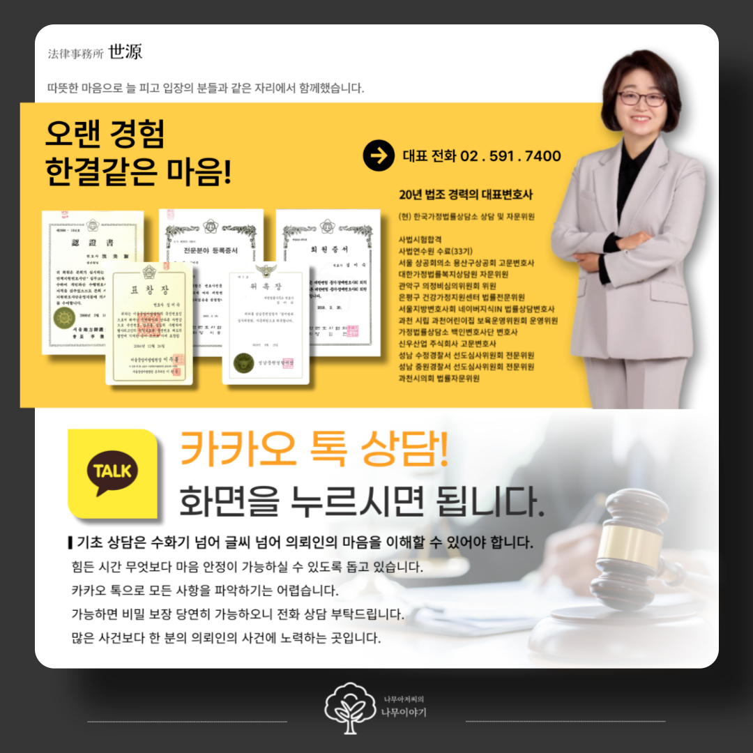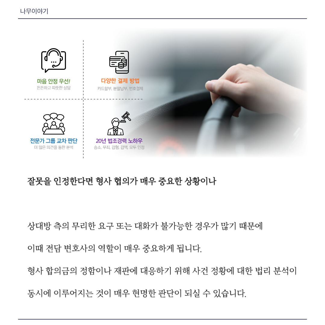 이런 상황을 감안하여 경찰, 검찰 수사단계 재판단계를 분리 선임하여 부담은 줄이고 빠른 법률조력을 통해 사건을 조기에 마무리하고, 의뢰인의 마음의 안정을 통한 일상의 회복을 지원하고 있습니다. 언제든 오시거나 전화주세요. 경험과 실력으로 함께합니다.