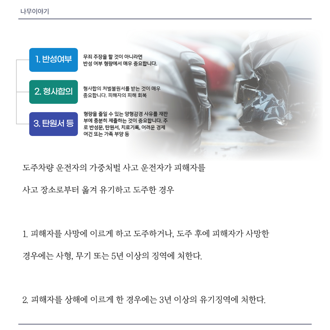 음주운전으로 인한 #뺑소니처벌 무기 또는 5년 이상의 징역이 선고될 수 있습니다. 벌금형이 아니라는 겁니다. 또한 상해를 입히고 도주한 경우 1년 이상 유기징역 또는 500만 원 이상 3,000만 원 이하 벌금에 처해질 수 있습니다. 음주로 인해 사고자를 유기하거나 만약 사망에 이르렀다면 사형, 무기징역 또는 5년 이상의 징역에 처해질 수 있고, 상해라 하더라도 3년 이상 유기징역에 처해질 수 있고 최근 그 어느 범죄 혐의보다 처벌이 중합니다. 실제로 2회 음주운전 기소, 재판으로 이어지고 있기에 간혹 실형에 이른 경우도 있기에 만만하게 여기시는 의뢰인들의 전화에 허탈함을 감출 수 없습니다.